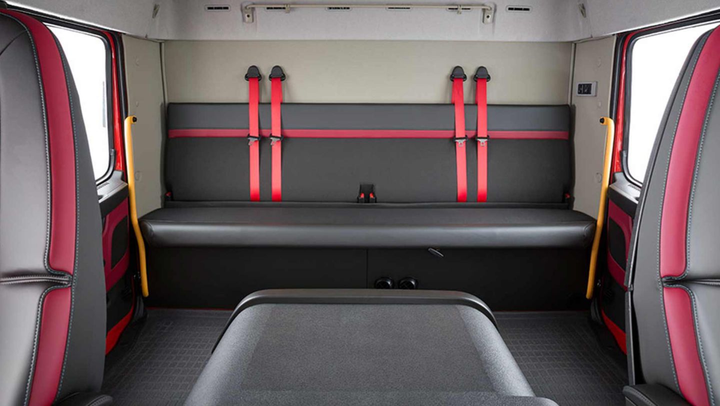Wyposażona w zawieszenie pneumatyczne kabina mieści do sześciu osób, a jej wnętrze, do którego prowadzą szeroko otwierane drzwi, jest łatwe w czyszczeniu.