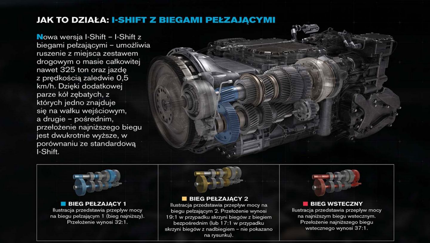 Opracowana przez Volvo Trucks nowa wersja I-Shift umożliwia zastosowanie w niej nawet dwóch biegów pełzających. Tak skonfigurowana skrzynia biegów umożliwia m.in. ruszanie z miejsca zestawem drogowym o masie całkowitej do 325 ton*.