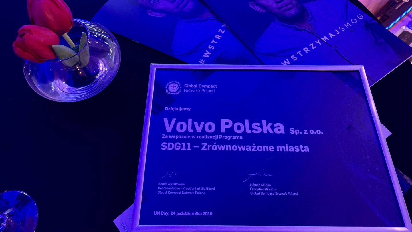 Wyróżnienie z rąk przedstawicieli polskiego biura Global Compact, największej na świecie platformy ONZ angażującej biznes w realizację Celów Zrównoważonego Rozwoju (SDG), Volvo odebrało podczas uroczystej gali UN Day w Warszawie. Poza Volvo Polska, nagrody za długotrwałą współpracę przy programie „SDG11 – Zrównoważone miasta”, w tym m.in. działania na rzecz kampanii „Wstrzymaj smog” otrzymali przedstawiciele 13 działających w kraju spółek. Volvo jest jedyną firmą motoryzacyjną.